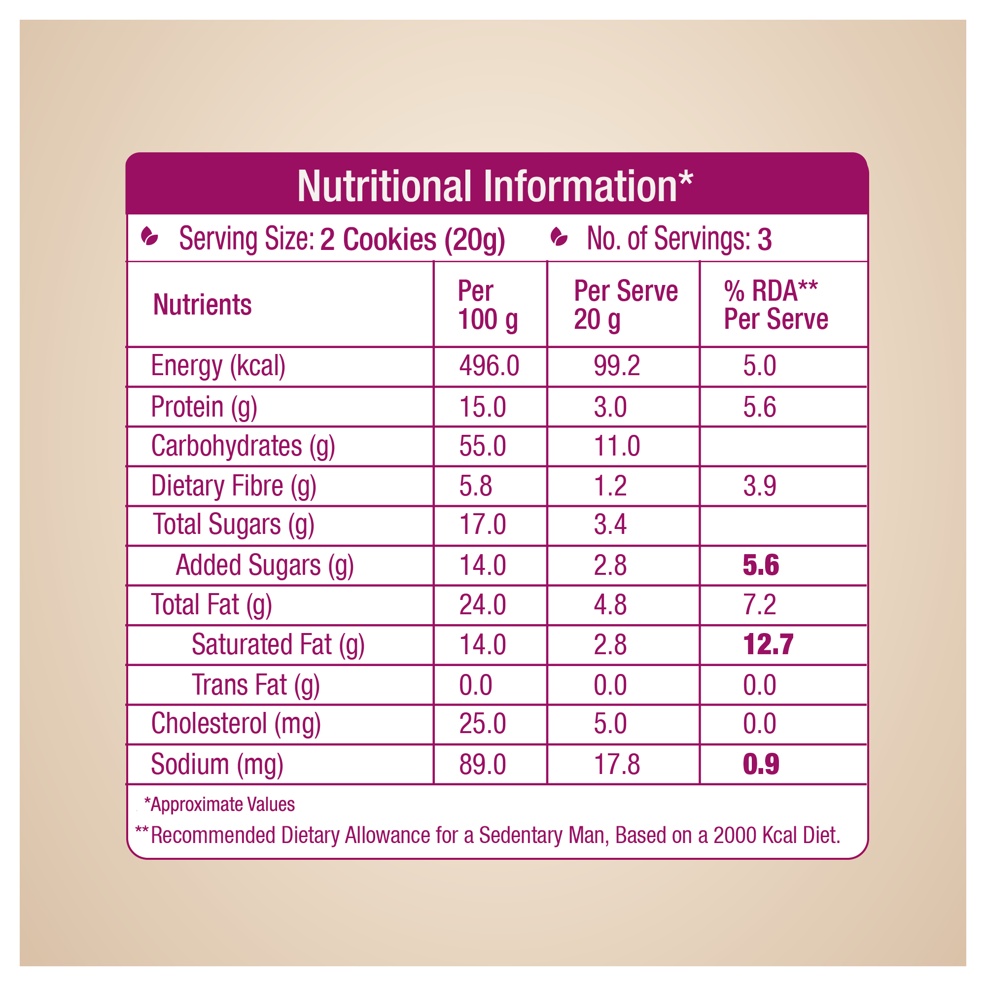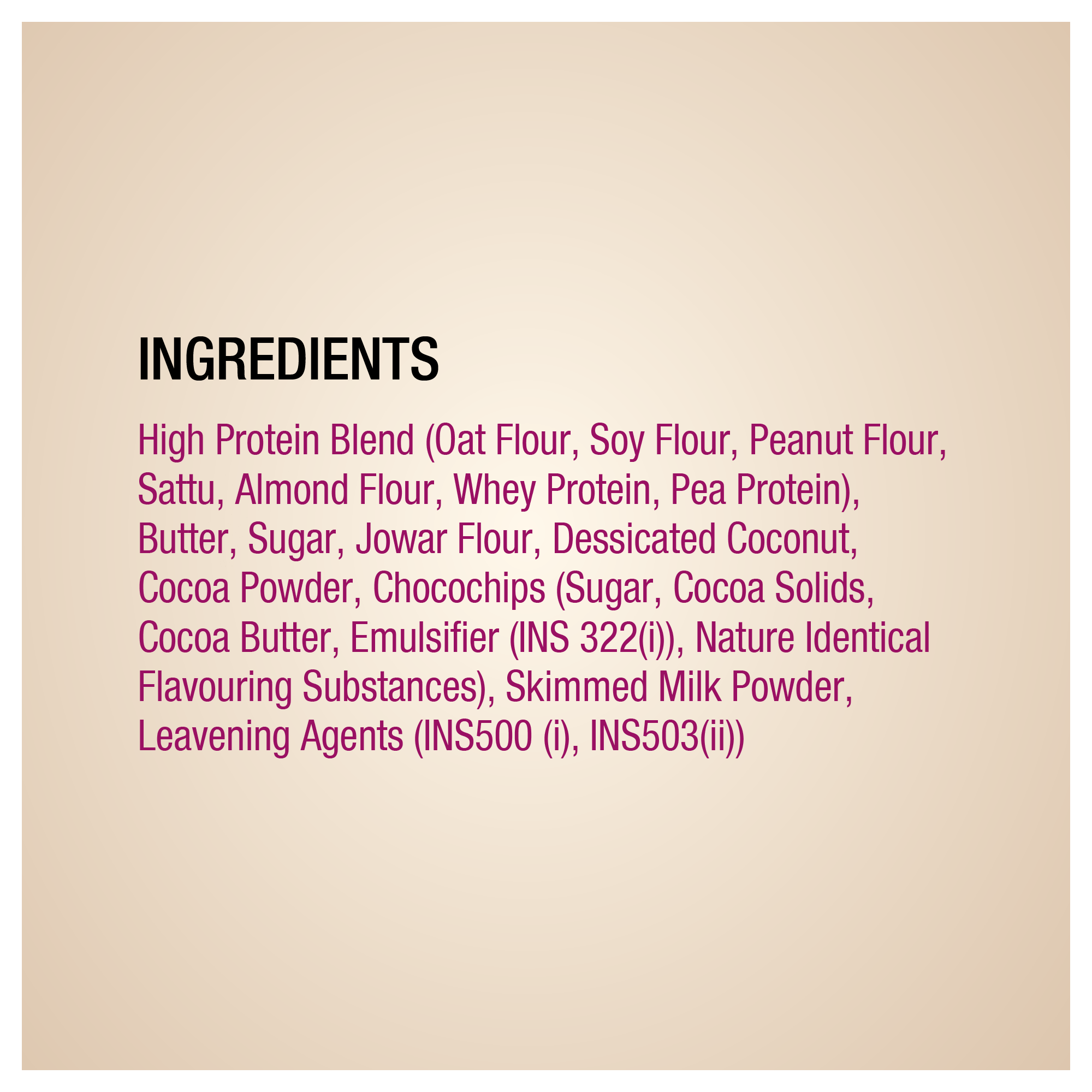 Chocolate chip cookies that do more. These gluten-free, high-protein cookies are made without maida, wheat or palm oil. Packed with real coconut, they’re eggless, fiber-rich and free from preservatives. 50% more protein now in cookies that are wholesome and anything but basic.